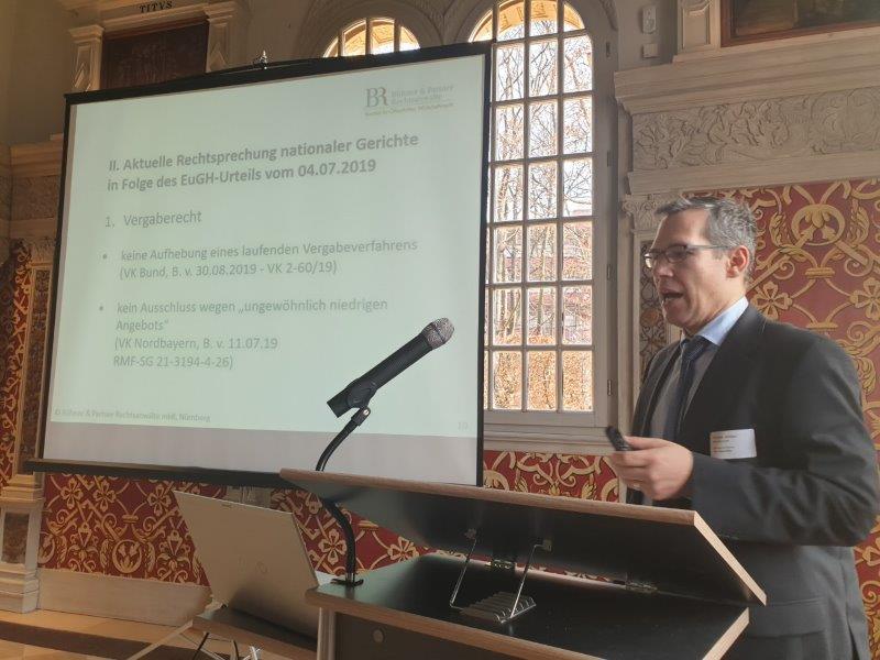 Zur siebten Auflage der Gemeinschaftsveranstaltung des Bayerischen Städtetags, der Bayerischen Staatszeitung und Bühner & Partner Rechtsanwälte mbB unter dem Titel "Architekten- und Planerleistungen sicher vergeben und fair bezahlen" waren am 06.12.2019 knapp 90 Teilnehmer in den Nürnberger Hirsvogelsaal gekommen, um sich über die Auswirkungen der neuen EuGH-Rechtsprechung vom 04.07.2019 (Rs. C-377/17) zu informieren.