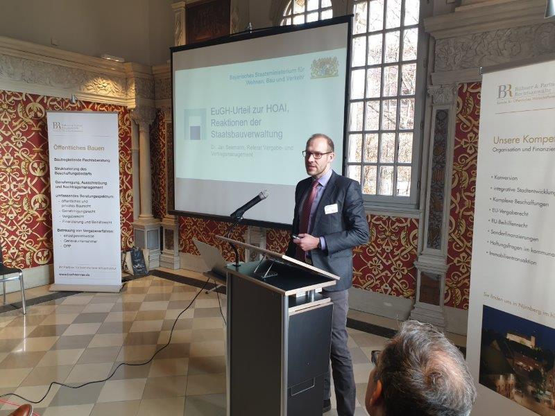 Dr. Jan Seemann (Bayerisches Staatsministerium für Wohnen, Bau und Verkehr) unterstrich in seinem Vortrag dann die eher pragmatische Herangehensweise des Ministeriums und die Schritte zur Anpassung der HOAI.