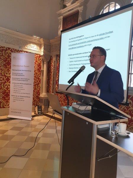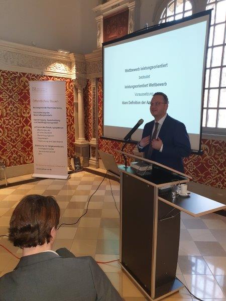 Rechtsanwalt Fabian Blomeyer (Bayerische Architektenkammer) unterstrich in seinem Vortrag, dass der Leistungswettbewerb genauso bestehen bleiben könne und müsse. Auch seien die HOAI und die RPW weiter anwendbar.
